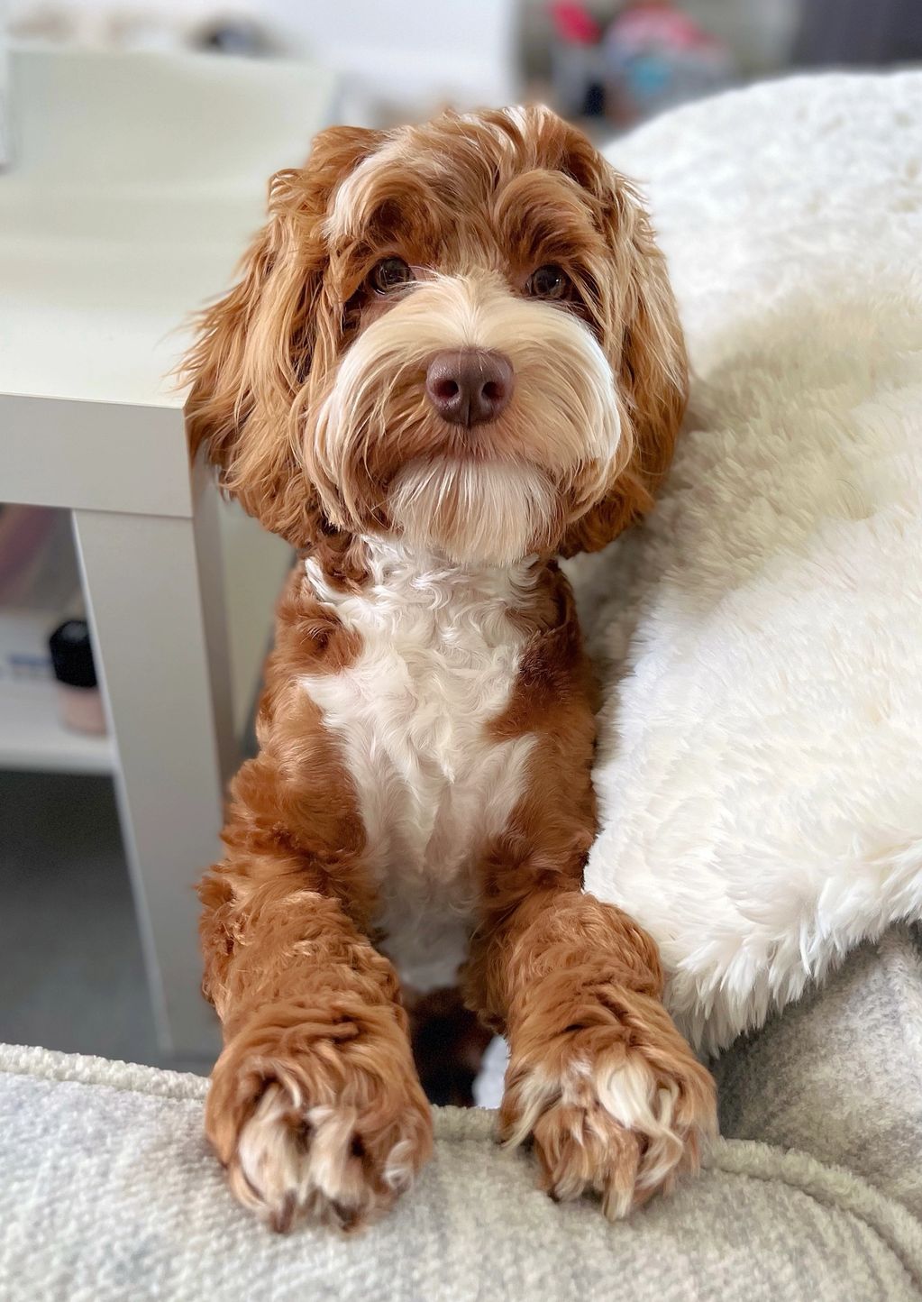 This laid back girl loves to cuddle. She is always ready to snuggle up together or go for a car ride! Annabelle loves our children and is a fantastic family dog.